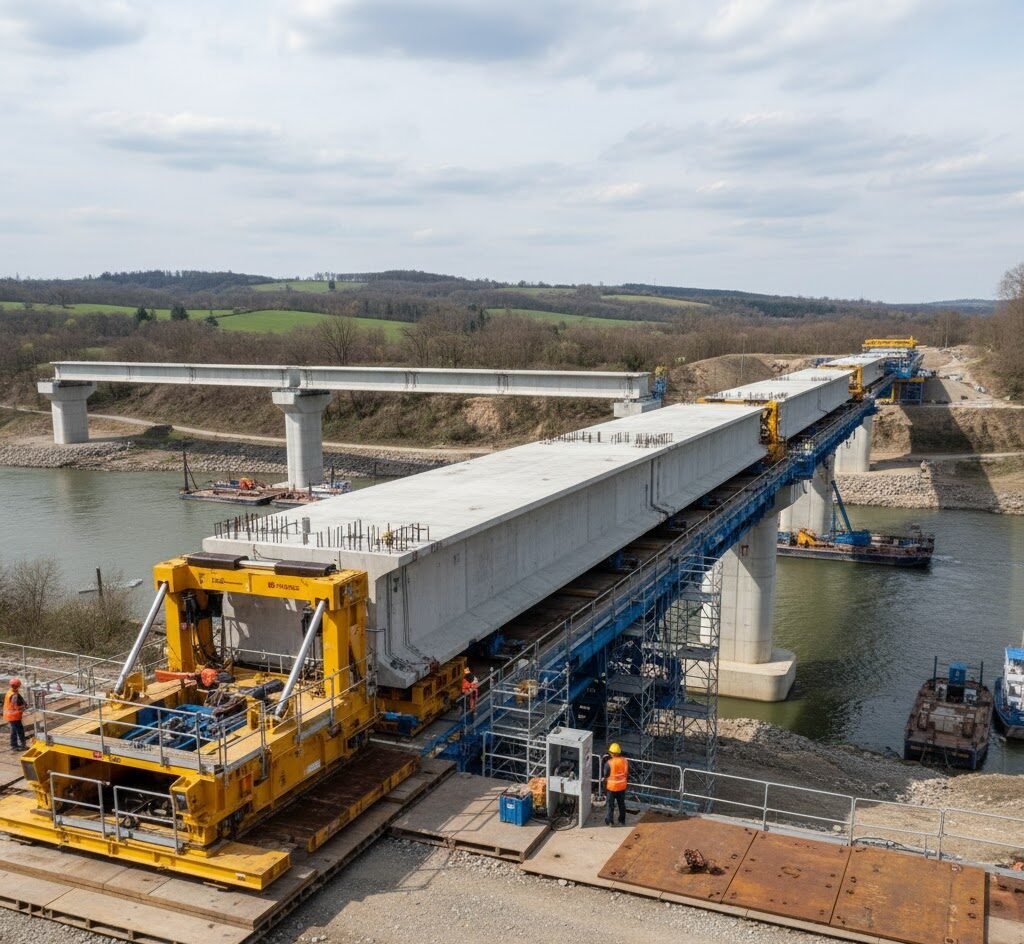 In this method, the bridge girders or superstructure segments are assembled and then forwarded (moved/shifted) horizontally into their final position using rollers, winches, or launching equipment